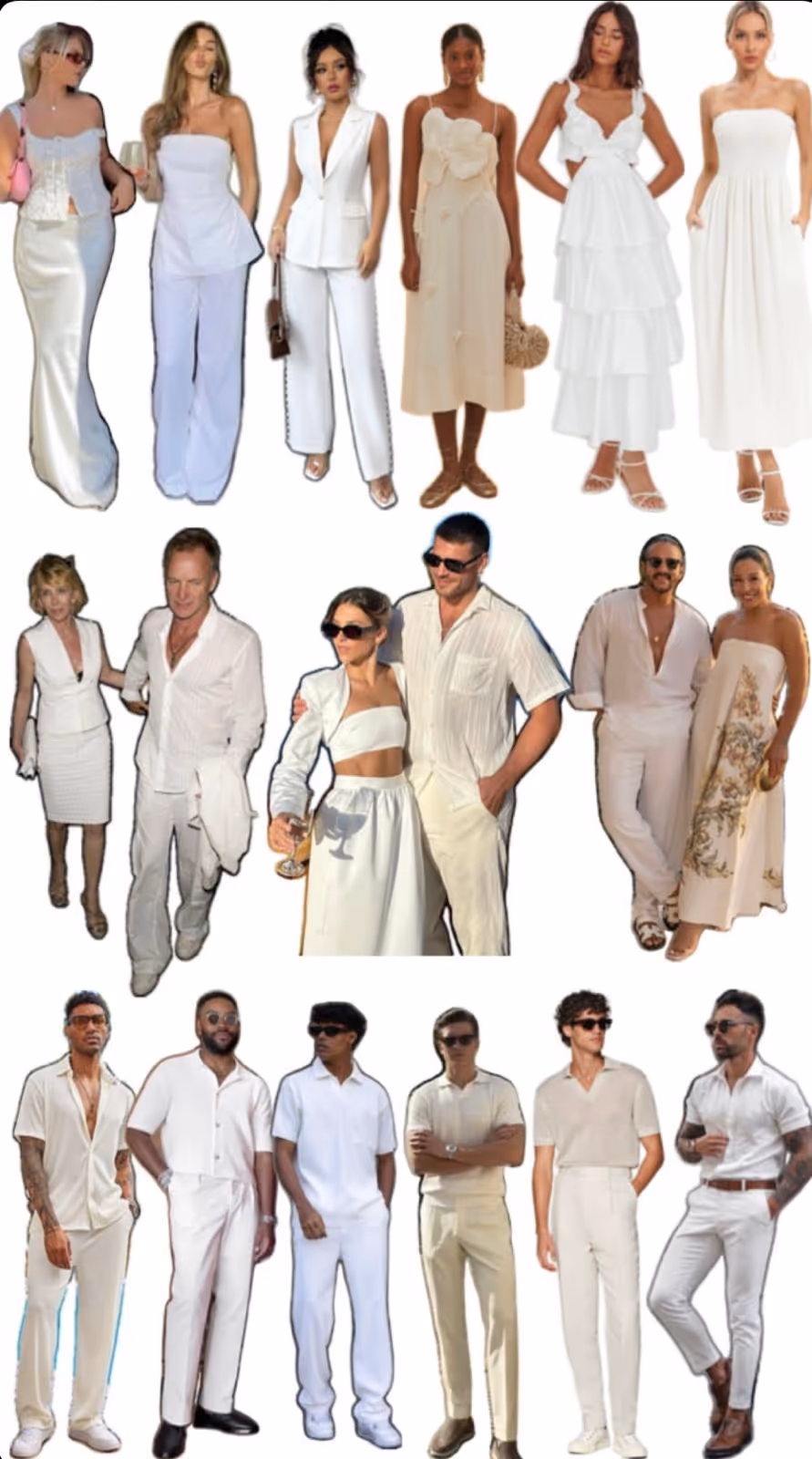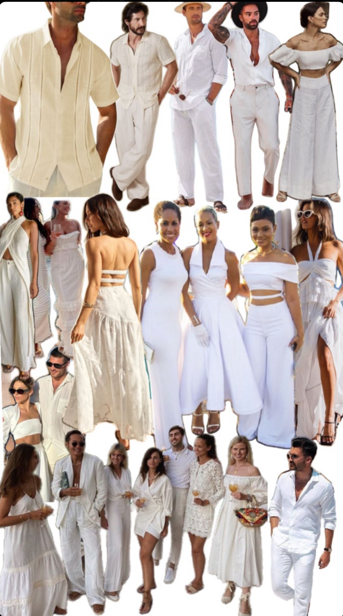 Men: Please wear all white. Recommended: White shirt paired with white or beige linen pants.