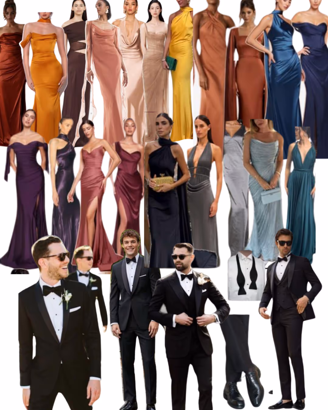 (floor-length or ankle-length) with a touch of Mountain Chic. Suggested colors: Earth tones and autumn shades. Dress guidelines: Floor-length or ankle-length formal gown. No prints, no sequins, and no shiny fabrics. Footwear: Elegant heels, preferably block or thick heels for comfort and stability. Color Restrictions: no white, no gold, no green.