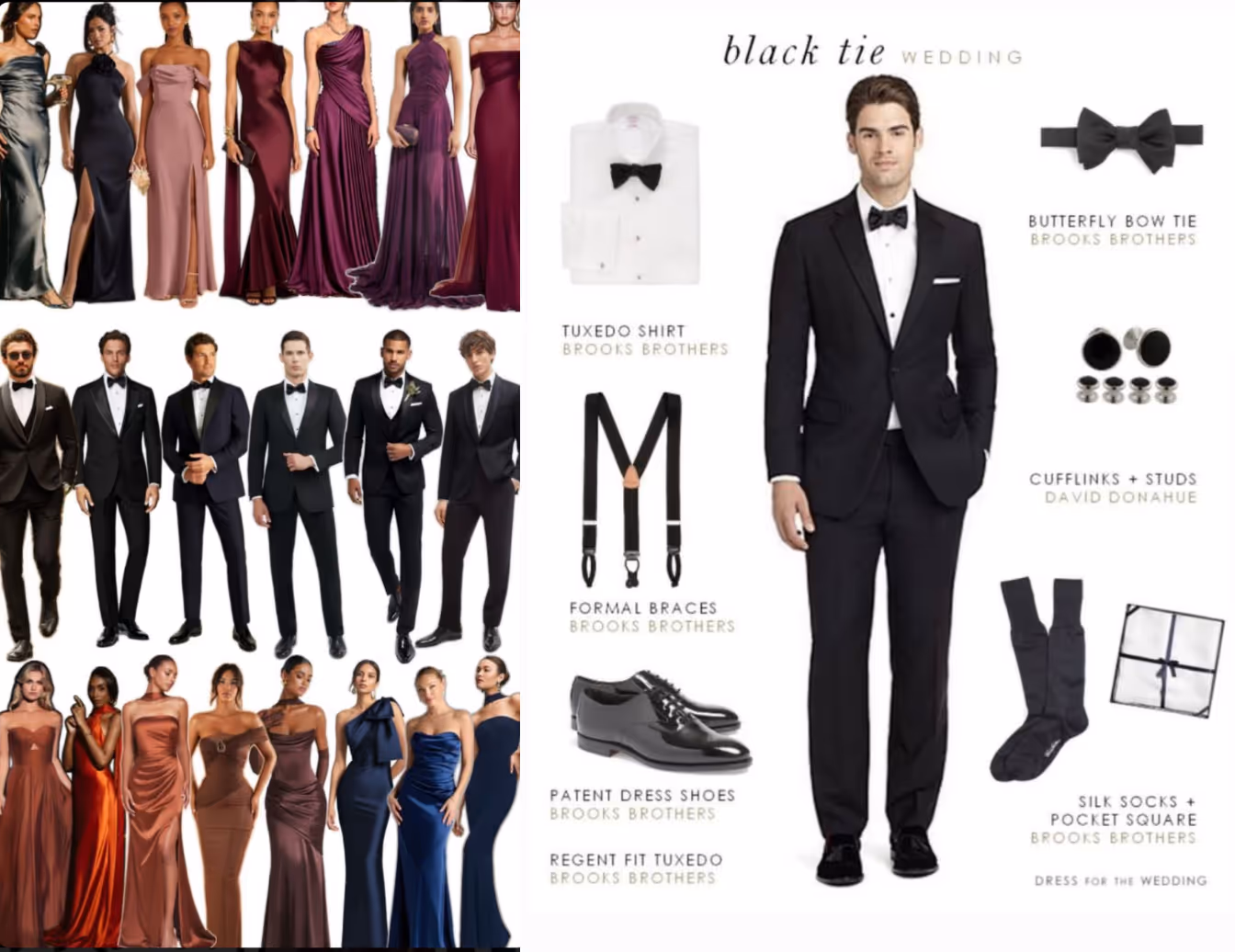 MEN: Tuxedo shirt: White, long-sleeved dress shirt with a collar. Footwear: Formal black dress shoes. Important: Please avoid other colors or styles that do not meet this dress code.